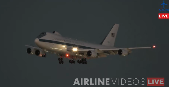 当地时间1月8日,被称为“末日飞机”的波音E-4B军机被拍到降落在洛杉矶国际机场。图源:美媒视频截图